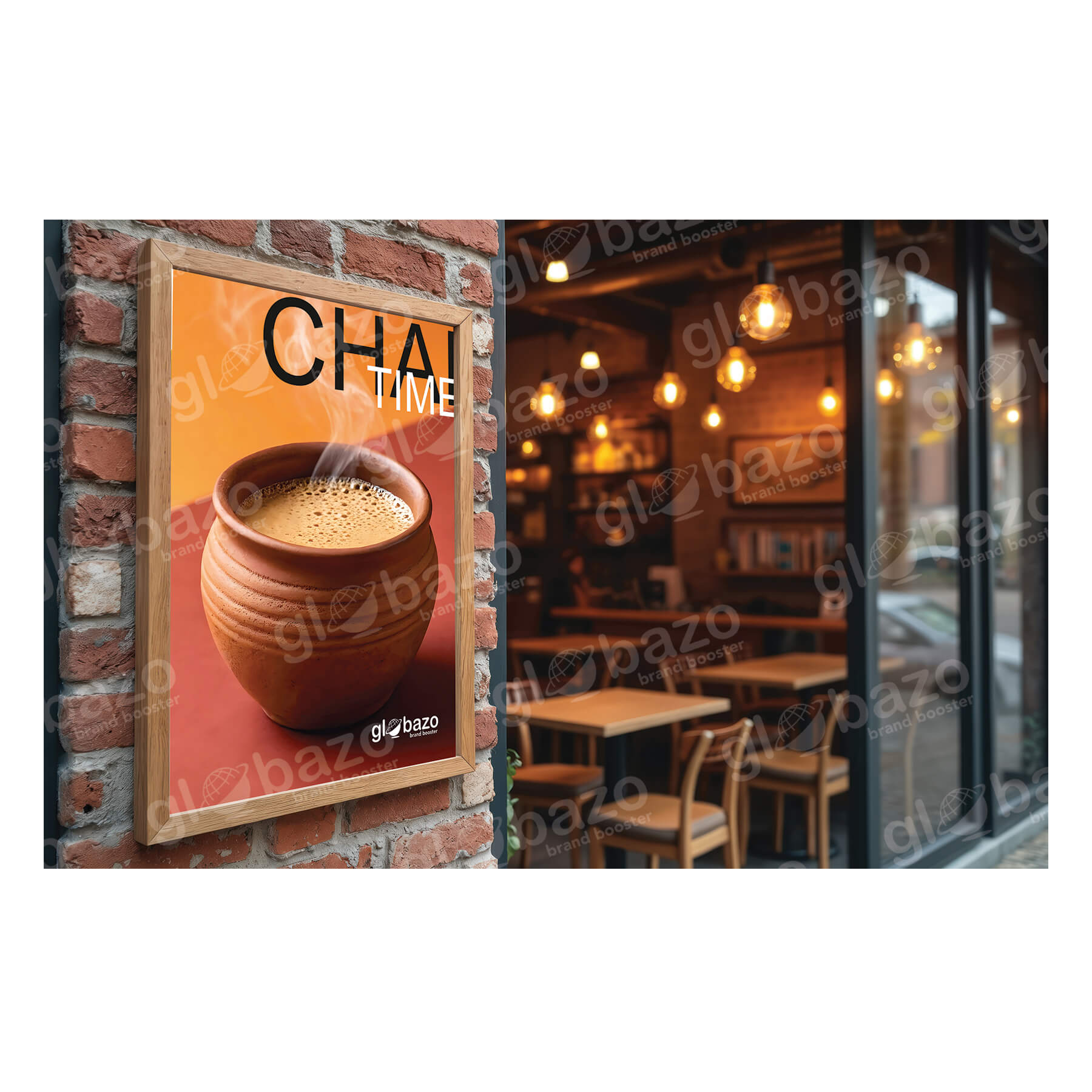 Warm and inviting flex design featuring a steaming traditional clay cup of chai against a vibrant gradient background, creating a strong tea-time promotional appeal.