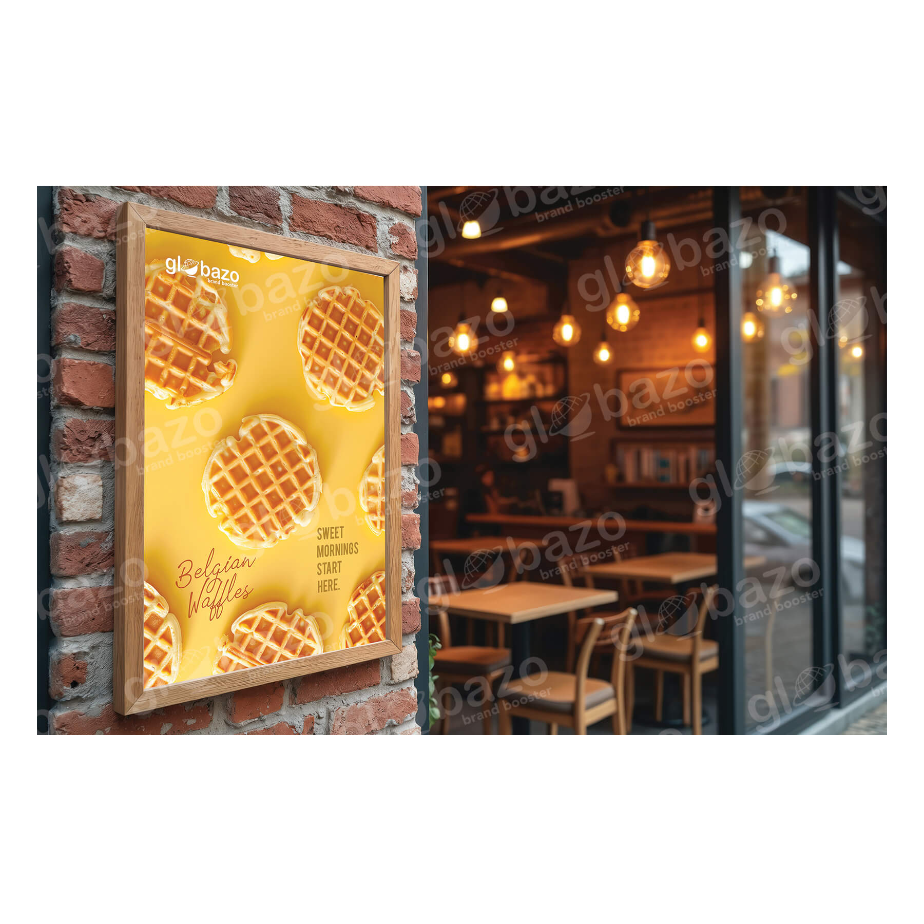 Bright breakfast flex design featuring golden Belgian waffles with the message “Sweet Mornings Start Here,” promoting a cheerful and tasty start to the day.