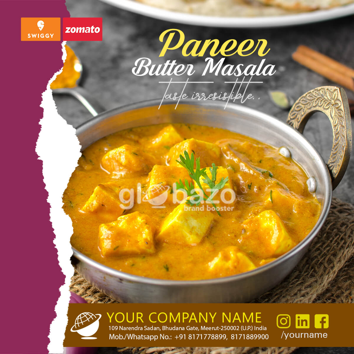 Main Course Specialty Master Dish according to your Shef/Restaurant/ Dhaba etc. under Your Brand Banner in a attractive way with Globazo.