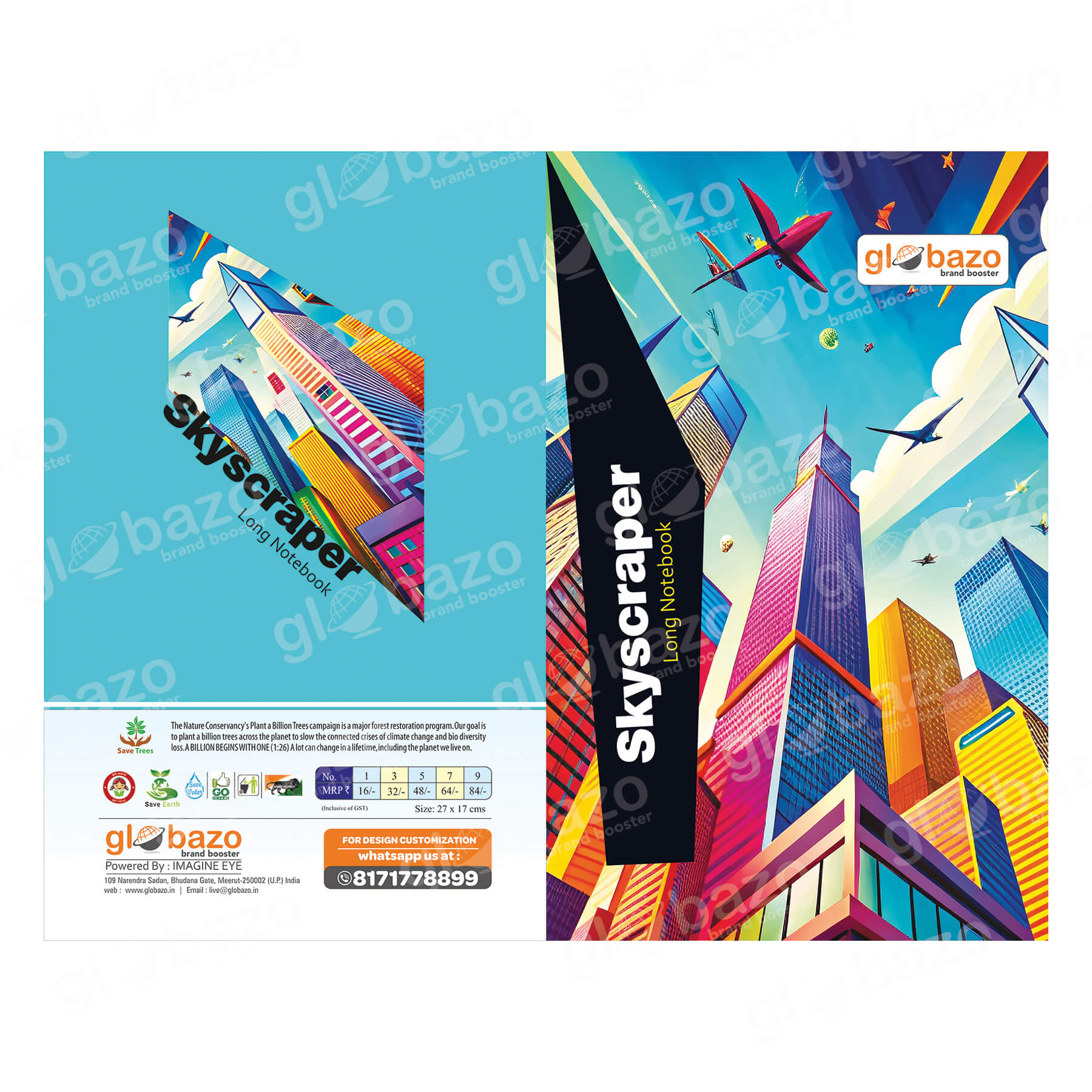 A vibrant futuristic cityscape notebook cover featuring colorful skyscrapers with a dynamic upward perspective and flying aircraft in a bright sky.