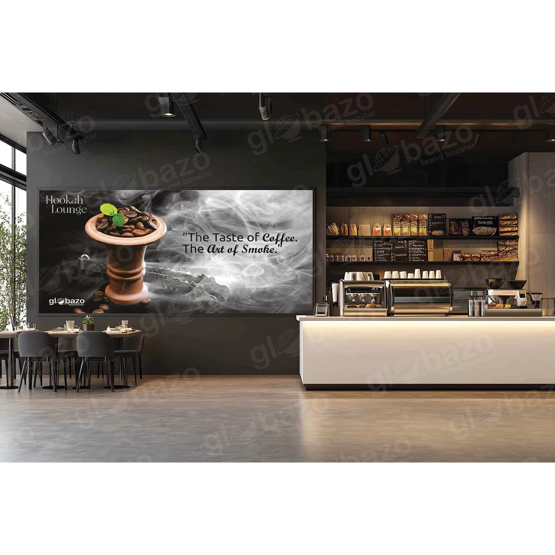 Creative hookah lounge flex banner blending coffee bean aesthetics with dense smoke visuals to convey a rich, aromatic premium experience.